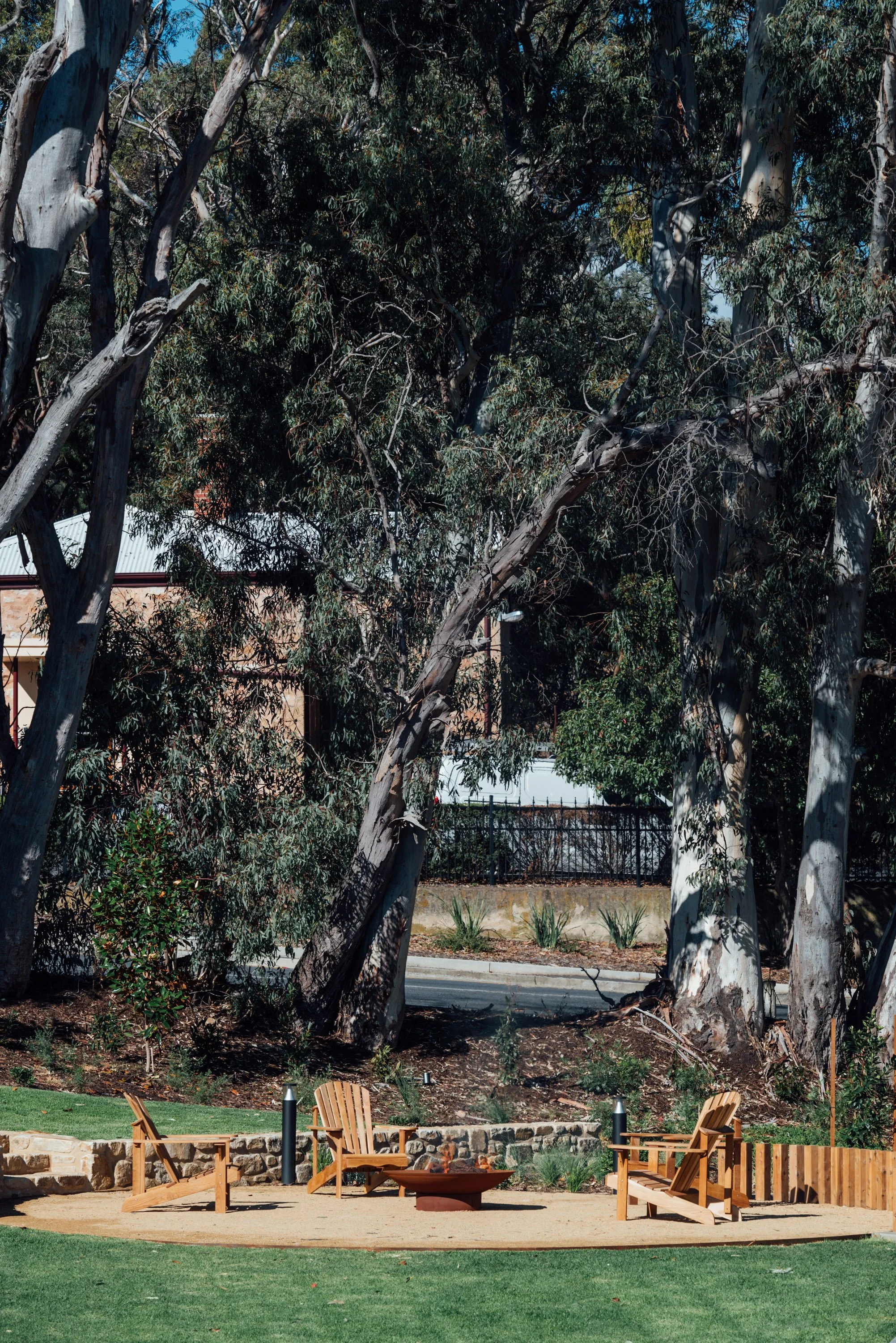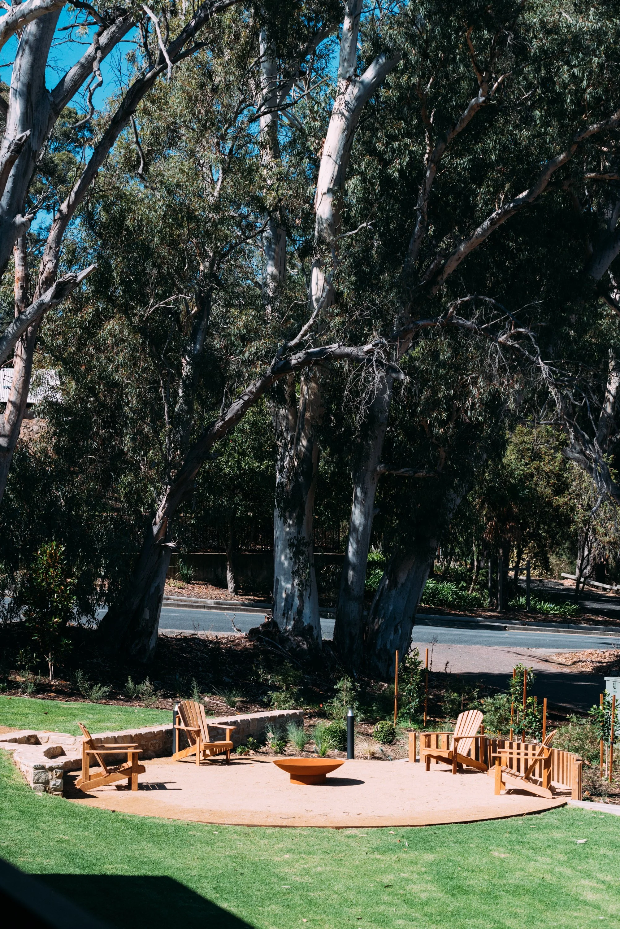 Three wooden chairs around a fire pit in a landscaped outdoor area with large trees and a road in the background.