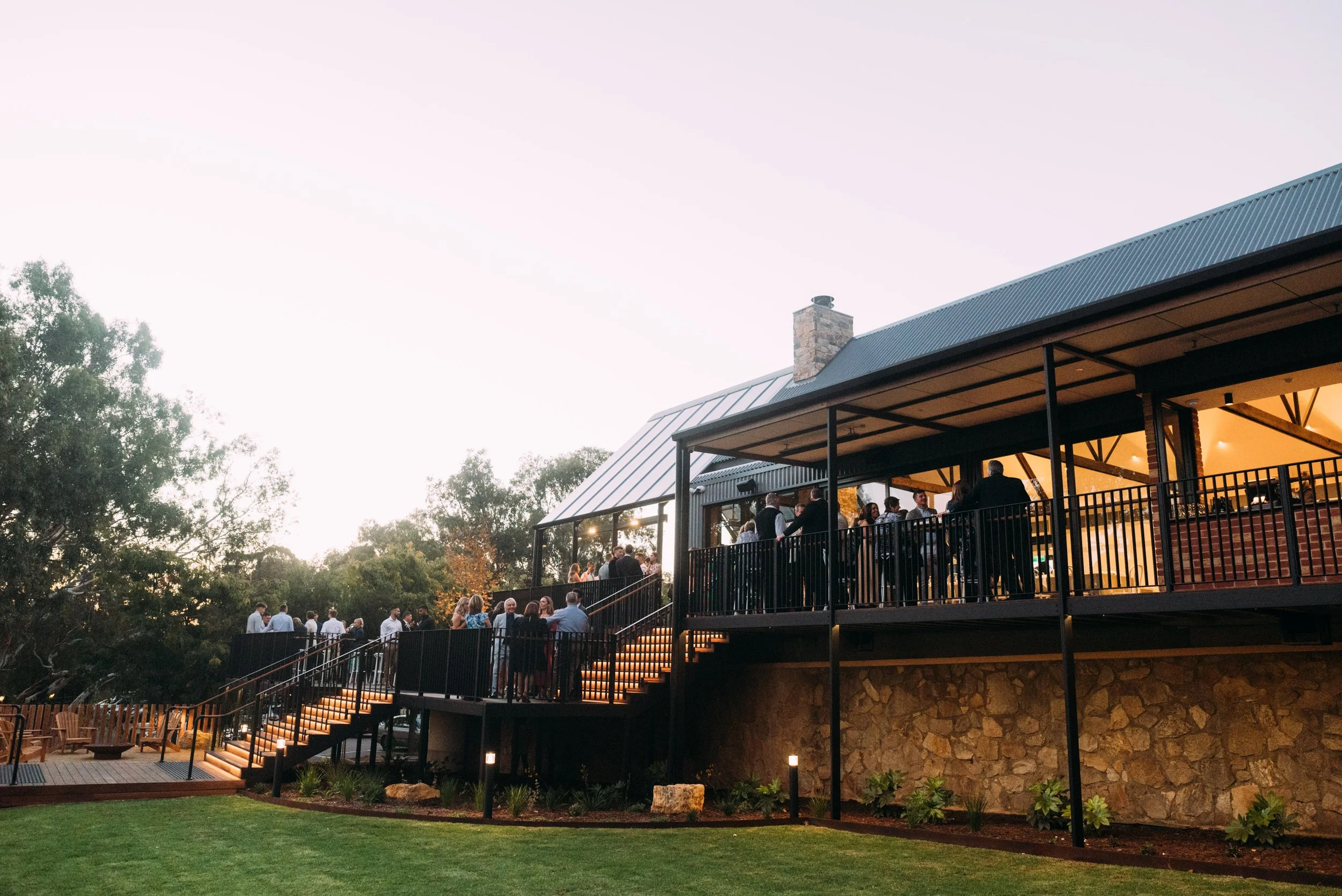 A modern rustic event venue with a crowd of people gathered on its outdoor terrace during sunset. The building has a metal roof, large glass windows, and a wooden exterior with steps leading up to the deck. There are trees and landscaped plants aroun