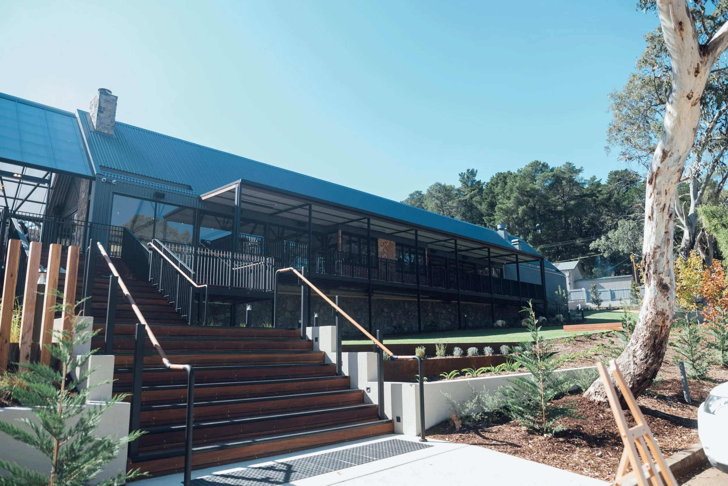 Modern building with metal roof and glass balcony, wooden stairs with metal railings, surrounded by landscaped garden and trees, in bright daylight.