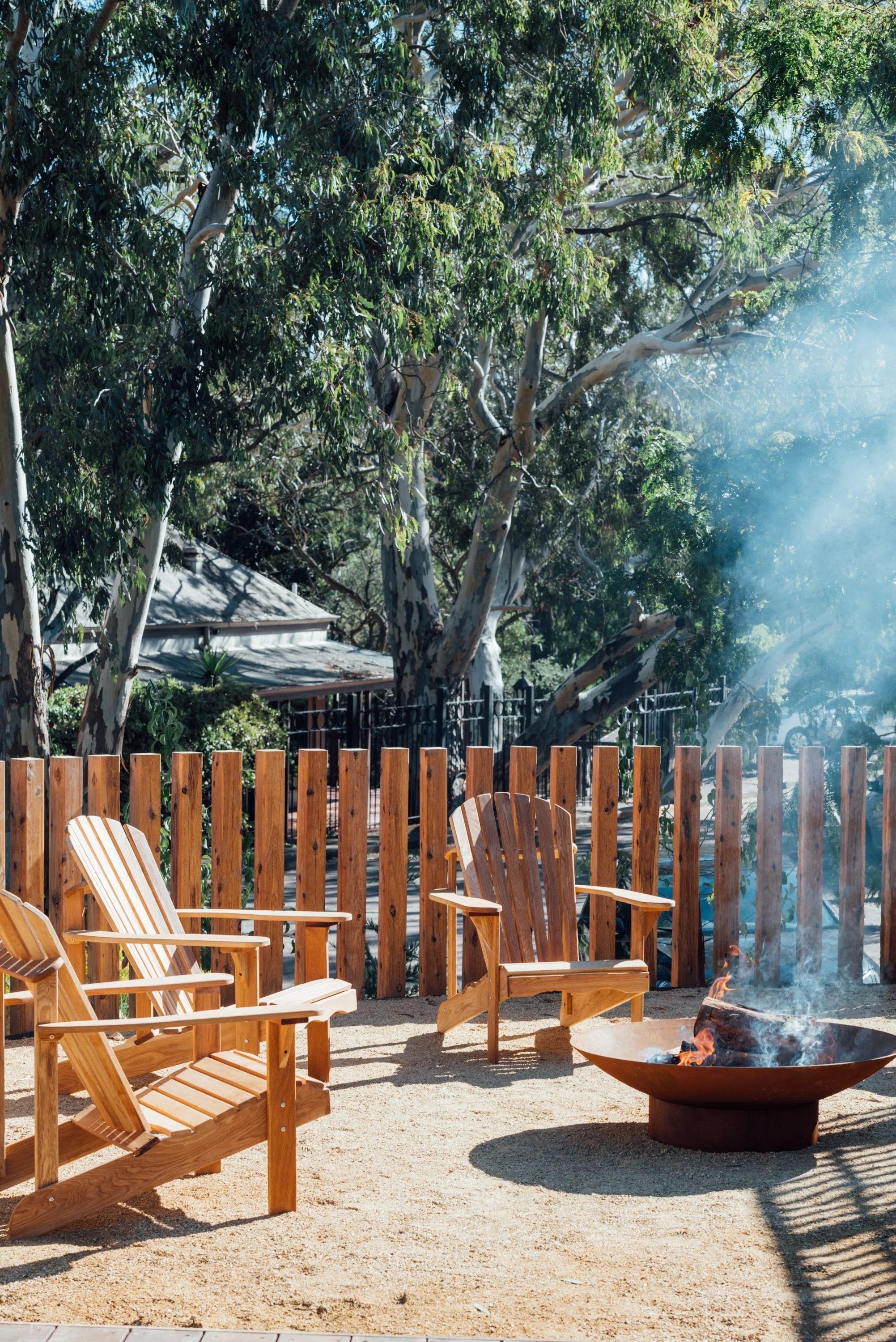 Three wooden Adirondack chairs around a fire pit with smoke, outside on a sandy surface, enclosed by a wooden fence, with large eucalyptus trees and a house in the background.